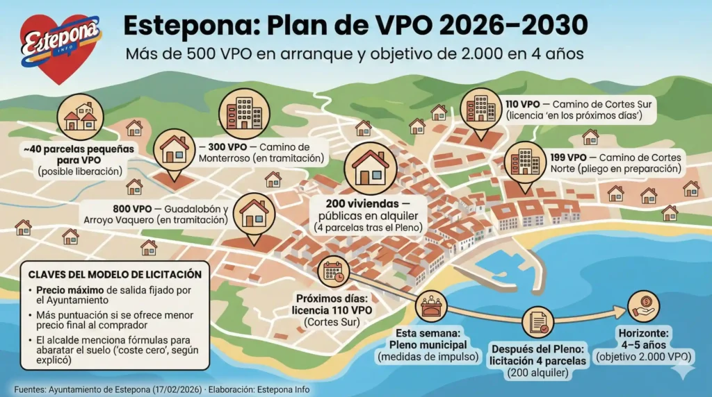 El alcalde de Estepona, José María García Urbano, ha presentado un paquete de medidas para iniciar la construcción de más de 500 Viviendas de Protección Oficial (VPO) y fijar el objetivo municipal de poner a disposición de los vecinos más de 2.000 VPO en los próximos cuatro años.