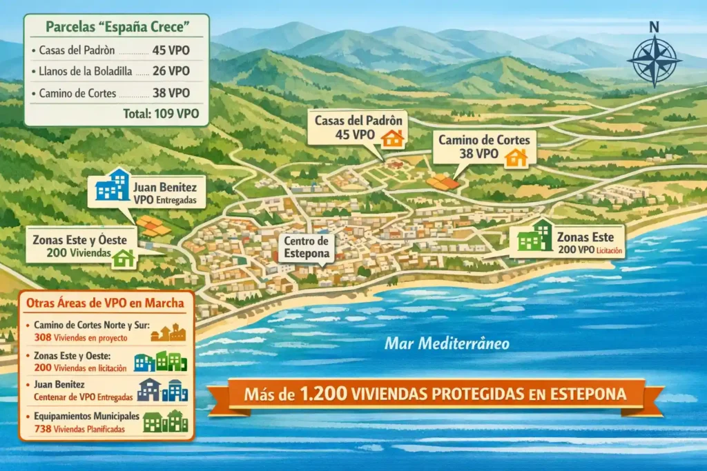 El Ayuntamiento de Estepona ha puesto a disposición del Gobierno central seis parcelas municipales con capacidad para levantar 109 viviendas de protección oficial (VPO), en un movimiento que posiciona al municipio como candidato a beneficiarse del fondo ‘España Crece’, el mayor plan de inversión en vivienda asequible anunciado en España en los últimos años.